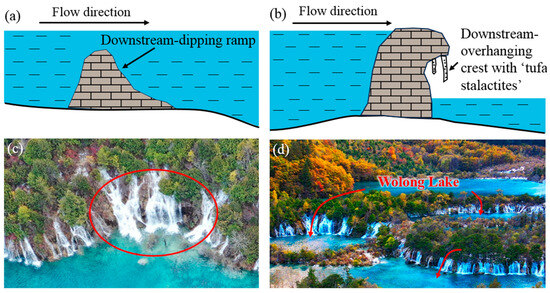 (a) Schematic diagram of downstream-dipping ramp; (b) schematic diagram of downstream-overhanging crest with tufa stalactites; (c) the real scenery of the downstream tufa dam of Wolong Lake; (d) the stepped terrain where the downstream tufa dams formed. (a,b) adapted from Carthew et al. [43].