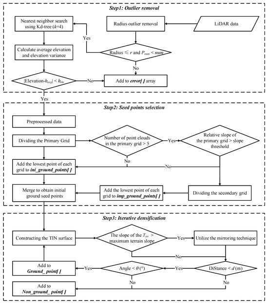 The proposed AGPTD algorithm overall contains three steps (Figure 1). The first step involves using a radius outlier removal algorithm and implementing a K-nearest neighbor search with the Kd-tree to eliminate outliers. The second step achieves adaptive grid selection based on the number of point clouds and relative slope in the primary grid. Specifically, additional seed points are selected through two levels of grids, and then they are added to the initial set of ground seed points. The third step uses the initial set of ground seed points to establish the initial TIN model. Based on the established iterative decision rules, each of the remaining unclassified points is evaluated one by one. If a point meets the criteria for a ground point, it is added to the TIN model. This process is reiterated until no new data points meet the decision criteria or the number of iterations reaches the maximum iteration limit.