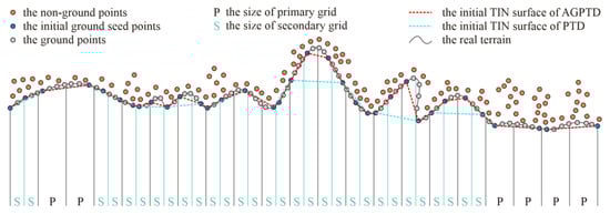 The classical progressive triangulated irregular network densification (PTD) algorithm proposed by Axelsson [23] has good robustness, effectiveness, and terrain adaptability. The algorithm builds an initial TIN surface using the initial ground seed point derived from the division of the regular grid. Subsequently, those ground points that meet the judgment conditions will be incrementally included in the set of ground points until a TIN surface close to the real ground is constructed. Nevertheless, the classical PTD filtering algorithm exhibits certain limitations in preserving terrain details and eliminating low points (i.e., outliers with lower elevations), owing to its sensitivity to the size of the grid [24,25,26,27,35,36].