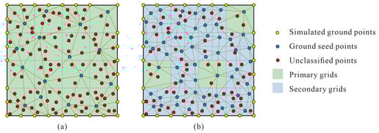 Construction of the initial TIN using ground seed points extracted by (a) regular grid and (b) adaptive grid. The usage of simulated ground points, which consist of the grid corners of the boundary, originates from Zhao et al. [38].