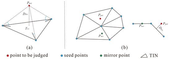 Step 2: Utilize the mirroring technique to enhance the acquisition of ground points, helping to prevent errors in the identification of and preserve disconnected terrain, particularly in areas with steep slopes (Figure 4b). If the slope of is greater than the maximum terrain slope (the maximum grid slope generated during the seed point selection process), is replaced by the corresponding mirror point and then judgment is performed in Step 3 [23,24,25,26,27]. is the vertex with the highest elevation value in and is the mirror point corresponding to . The formula is shown in Equation (6).