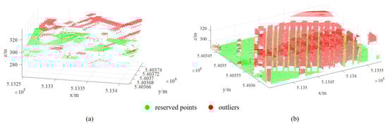 There were anomalous outliers in the point cloud datasets, including high outliers, low outliers, and isolated noise points, due to various uncontrollable factors. Here, the radius outlier removal algorithm and Kd-tree were utilized to identify and eliminate outliers in the point cloud datasets. Table 3 presents the results of the outlier removal process. For the 15 sample datasets analyzed, the precision of outlier removal ranges from 97.14% to 99.97%. Additionally, the proportion of filtered non-ground points relative to actual non-ground points for those samples spans from 34.27% to 97.82%. The count of filtered outliers shows significant variation among those samples, predominantly due to the varying numbers of both low points and extreme high points for each sample. As detailed in the dataset description, Sample 41 exhibits a clump of low points arising from multipath error, while Sample 42 demonstrates low (objects) and high points reflecting high-frequency landscape variations. The outlier results for Samples 41 and 42 highlight the superior proficiency of the proposed algorithm in eliminating both the low points and the extreme high points, with specific examples illustrated in Figure 5.