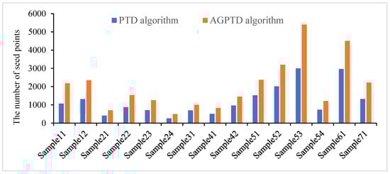 Figure 7 provides a visual representation of seed point selection outcomes for Samples 52 and 53. The results are consistent using the PTD and AGPTD algorithms in flat areas. However, in regions with disconnected terrain, the quantity and distribution of ground seed points extracted using the classical PTD algorithm with a regular grid struggle to capture terrain details. Conversely, deploying the AGPTD algorithm in such areas can preserve the terrain details more effectively, ensuring that the initial TIN facet is not overly smoothed.