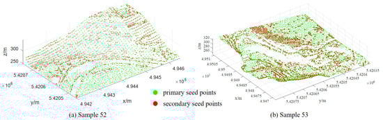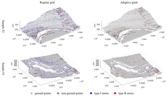 Figure 8 illustrates the outcome of iterative densification for Sample 52 and Sample 53. After removing outliers, point cloud data were subjected to iterative densification using the regular grids and the adaptive grids, respectively. A comparison of Figure 7 and Figure 8 reveals that the regions where a significant reduction in T.I occurred correspond closely with the initial ground seed points identified by the secondary grid in the AGPTD algorithm. This finding confirms that preserving as many terrain details as possible before the iterative densification process effectively reduces filtering errors, especially for T.I.