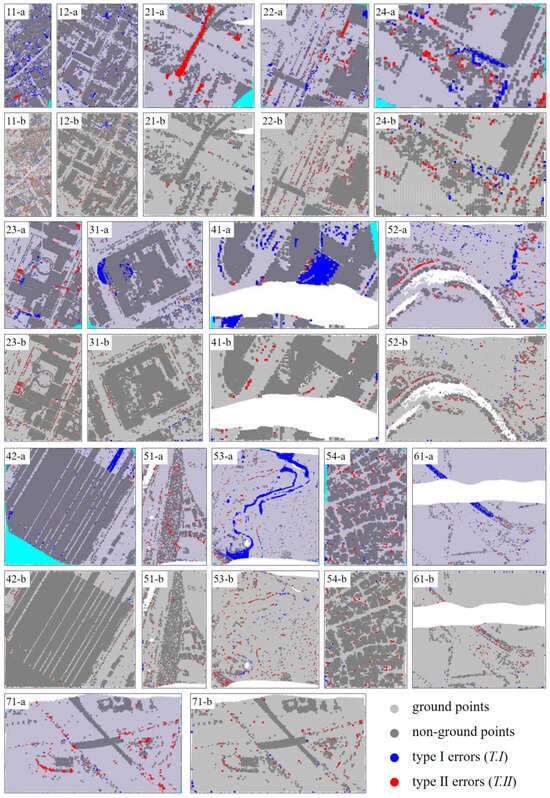 Figure 9 presents the filtering outcomes for 15 sample datasets. The AGPTD algorithm addresses the issues encountered with the classical PTD algorithm in https://www.itc.nl/isprs/wgIII-3/filtertest/report/ (accessed on 30 September 2024), specifically bridges in Sample 21 and gangways in Sample 22, which effectively reduces T.II. Moreover, the AGPTD algorithm rectifies the misclassification of non-ground points as ground points in slope areas of Sample 51 and regions with disconnected terrain in Sample 53, further reducing T.II. Additionally, the AGPTD algorithm overcomes the deficiencies of the classical PTD in processing low points in Sample 31 and unfiltered courtyards in Sample 41, effectively decreasing T.I. These enhancements significantly improve the performance of the AGPTD algorithm, reducing both T.I and T.II, and further demonstrating that the AGPTD algorithm outperforms the classical PTD in preserving ground feature points.