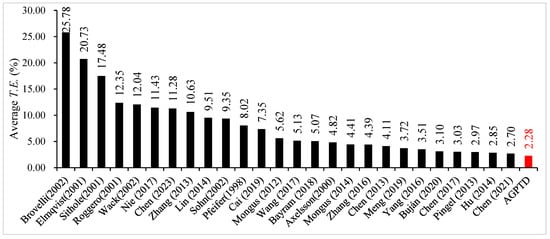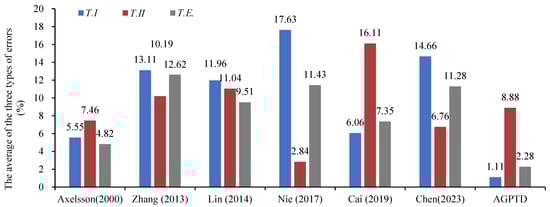 The average of T.I, T.II, and T.E. for the 15 samples using the classical PTD algorithm, five improved PTD algorithms, and the AGPTD algorithm [23,24,25,26,27,36].