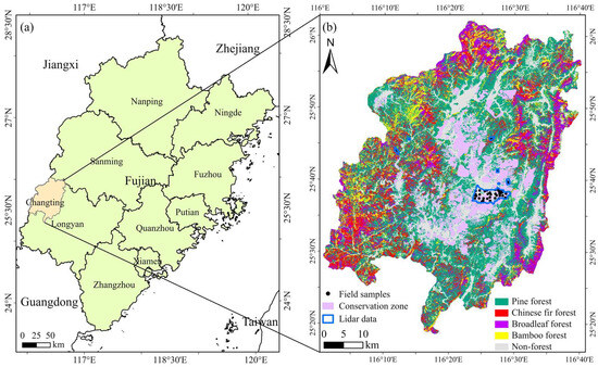 Study area—Changting County, in the western part of Fujian Province, China ((a) Location of Changting County; (b) Distribution of major land cover types, overlaid by the conservation area, Lidar data, and field samples).