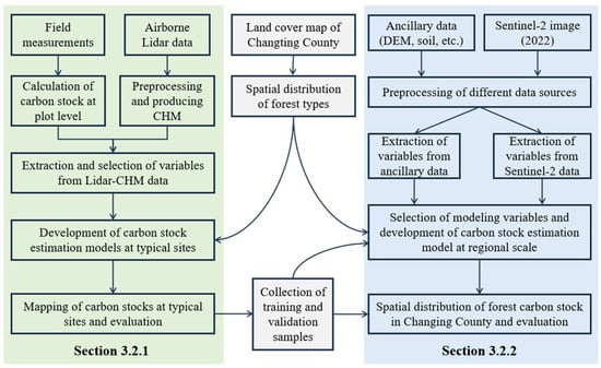Changting County has faced long-term soil erosion problems over the past several decades, resulting in poor soil fertility and the lack of a surface soil layer. In contrast, the continuous implementation of soil and water conservation services in the last three decades generated some unique forest characteristics. These included a relatively simple composition of vegetation species and stand structures, creating a different forest ecosystem compared to other tropical regions without serious soil erosion issues. It is necessary to understand the effects of soil and water conservation on the restoration of this forest ecosystem; thus, accurate estimation of the forest carbon stock in a timely manner becomes an urgent task. However, the limited number of sample plots with less representativeness across the entire study area makes it difficult to effectively develop a forest carbon stock estimation model. The roles of using airborne Lidar data as a linkage between sample plots and Sentinel-2 data in developing forest carbon stock estimation models and the performance of using optical sensor data such as Sentinel-2 for this estimation in a relatively simple forest stand structure are unclear.