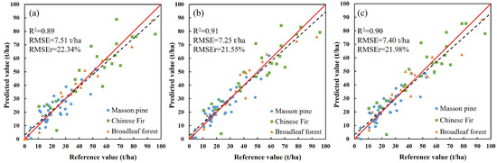 Scatter plots between predicted carbon stock from Lidar data and reference data from field measurements in typical areas using Bayesian hierarchical model ((a)—forest type and soil subgroup, (b)—forest type and conservation or not, (c)—forest type and slope group).