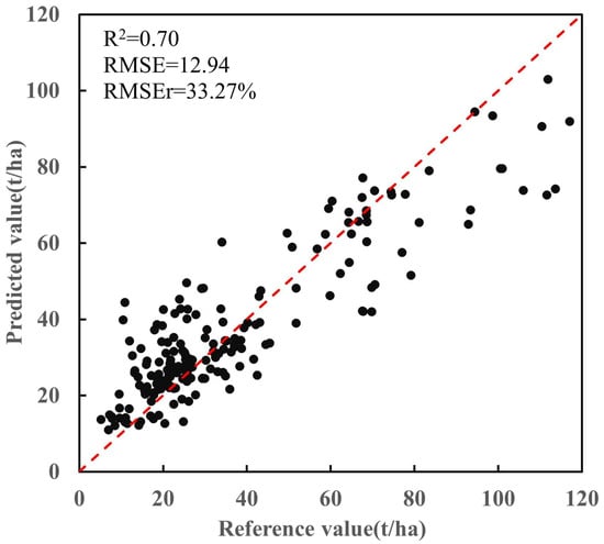Scatter plot between predicted carbon stock and reference data at regional scale (The red line represents 1:1 line).