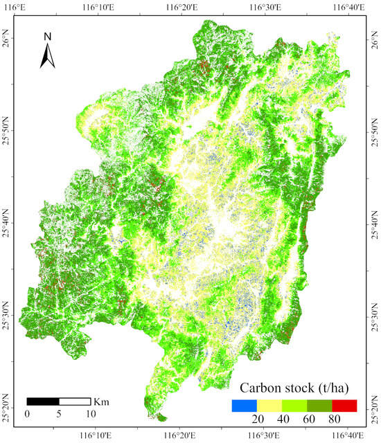 The evaluation of the prediction results (Figure 5) showed a good modeling performance with an R2 of 0.7 and RMSE of 12.94 t/ha. The figure shows the common problem that overestimation existed when the carbon stock was relatively small such as less than 20 t/ha, and underestimation existed when the carbon stock was larger than 80 t/ha, which is the same conclusion as in previous publications when the random forest method was used to develop biomass or carbon stock estimation models because of the overfitting problem and data saturation problem [18,31]. Based on the statistical analysis of the predicted carbon stock in Changting County (Figure 6), a carbon stock value of less than 20 t/ha accounted for 3.78% and a value of greater than 80 t/ha accounted for only 0.86%; most regions had carbon stock values within the range between 20 t/ha and 80 t/ha. Figure 6 indicates the different spatial patterns of the carbon stock distribution in the county, that is, the western and eastern parts had higher values (greater than 60 t/ha) than the central and southern parts (less than 40 t/ha). The carbon stock was especially low in Hetian basin due to a serious soil erosion problem in the past decades.