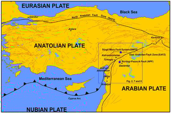 On 6 February 2023, highly destructive seismic events occurred in southern Türkiye and northern Syria. These earthquakes were associated with the activity of the East Anatolian Fault Zone (EAFZ), a first-order tectonic structure that constitutes the boundary between the Arabian and Anatolian plates. Interest in the tectonic, seismological, geophysical, and structural study of the EAFZ has been growing since its first definition and description by Allen (1969) [1] and Arpat and Şaroğlu (1972) [2]. Due to its relative youth (Late Pliocene, e.g., [3,4]), the EAFZ is considered an immature (e.g., [5,6]), strongly segmented (e.g., [3,7,8]) structure. It is described as a complex strike–slip-type fault, showing a complex and irregular set of structures, with abundant parallel faults, oversteps, releasing and restraining bending zones, folds, and normal or reverse faults (see, e.g., [8] for a detailed description).