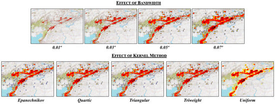 Evaluation of the impact on seismic density distribution due to changes in bandwidth (upper part of the figure) and the kernel method employed (lower part of the figure). As shown, lower bandwidth values generate more detailed results but introduce greater noise, while higher values emphasize regional patterns at the expense of local details. The kernel method determines the influence of a value on its surroundings, as illustrated by the functions shown in Figure 5. The choice of kernel function shows minimal differences (except for the uniform method) compared to the impact of bandwidth variations.