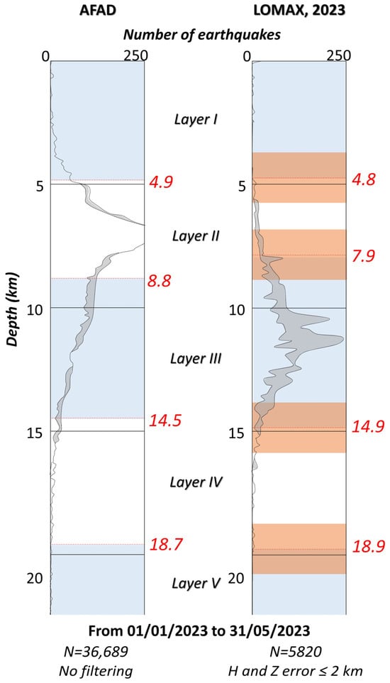 Comparison of the depth distribution of seismicity (number of earthquakes vs. depth). Left: Non-filtered data from the Disaster and Emergency Management Authority (AFAD) dataset. Right: Relocated and filtered data from Lomax (2023) [35]. Layers separated by zones with minimum earthquake frequency are highlighted in alternating blue and white bands (Layers I–V). For raw data: Layer I (0.0–4.9 km), Layer II (4.9–8.8 km), Layer III (8.8–14.5 km), Layer IV (14.5–18.7 km), and Layer V (below 18.7 km). For filtered data: Layer I (0.0–4.8 km), Layer II (4.8–7.9 km), Layer III (7.9–14.9 km), Layer IV (14.9–18.9 km), and Layer V (below 18.9 km). An orange ±1 km range (less than the uncertainty in the location, ±2 km, by Lomax, 2023 [35]) is used to illustrate the statistical concordance of the layers observed in both datasets.