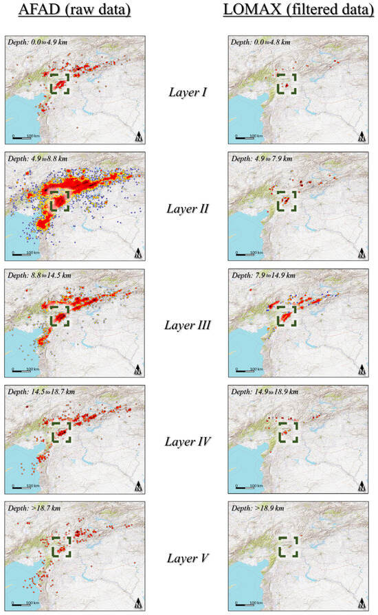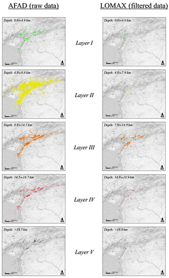 Although the differences between the depths of the boundaries of the layers defined by raw (AFAD) and filtered (Lomax [35]) data are smaller than the error in determining the depth of the earthquakes—up to 2 km for the filtered data—there is a significant variation in the density of earthquakes for each layer in both datasets, as indicated above (Figure 6), which are analyzed in more detail below.