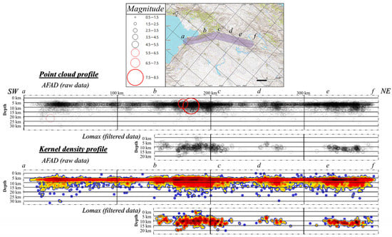 Seismicity profiles along the Main Strand of the EAFZ oriented approximately N60°E. Upper image: The location of the profile and the buffer used to select the seismic foci. Center of the figure: Point cloud of earthquakes at different depths, differentiated by magnitude. Upper: Raw data (AFAD); Lower: filtered data (Lomax, 2023 [35]). At the bottom of the figure: Kernel density profiles. Upper: Raw data; Lower: filtered data. Different points are marked with letters both on the profiles and on the map to accurately locate the black loci.