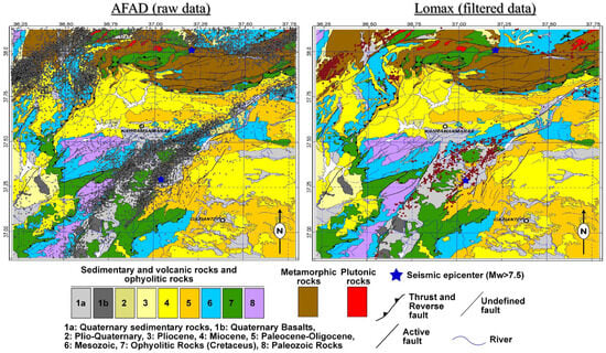 Detailed geological map of the surroundings of the major earthquakes, with epicenters from both datasets: AFAD (raw dataset, black dots) on the left and Lomax (2023) [35] (relocated-filtered, red dots) on the right.