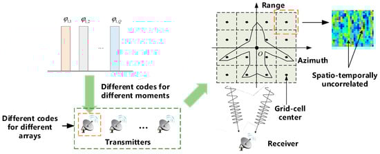 The radar system comprises N transmitting antennas and one receiving antenna. The imaging plane is assumed to be divided into L grids. A total of M modulations are performed. Each antenna transmits a distinct coded signal at different moments. At the mth modulation, the signal transmitted by the nth transmitter can be expressed as