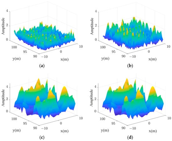 Wavefront undulations of different bandwidths at the same moment. (a) B = 200 MHz. (b) B = 400 MHz. (c) B = 600 MHz. (d) B = 800 MHz.