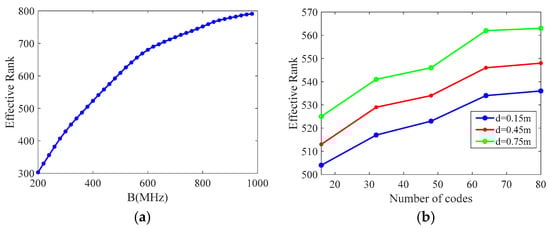 Effective-rank change curves for different influencing factors. (a) Effective-rank change curves at different bandwidths. (b) Effective-rank change curves with different array spacings and numbers of codes.