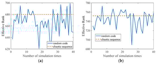 Variation in the effective rank corresponding to random codes and chaotic sequences for different imaging times. (a) B = 600 MHz. (b) B = 800 MHz.