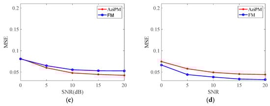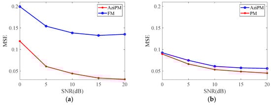 Figure 9a depicts the MSE-versus-SNR curves of the two methods. It can be observed that the MSE curve of the AziPM method is considerably lower than that of the FM method, which suggests that the imaging performance of the AziPM is superior to that of the FM method.