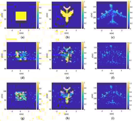 Imaging results for different targets. (a–c) Targets. (d–f) Imaging results at 0 dB. (g–i) Imaging results at 5 dB.