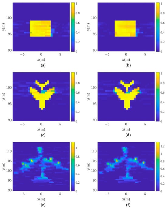 The same three targets were reconstructed by using the ADMM-based total variation method. The resulting imaging results are presented in Figure 13.