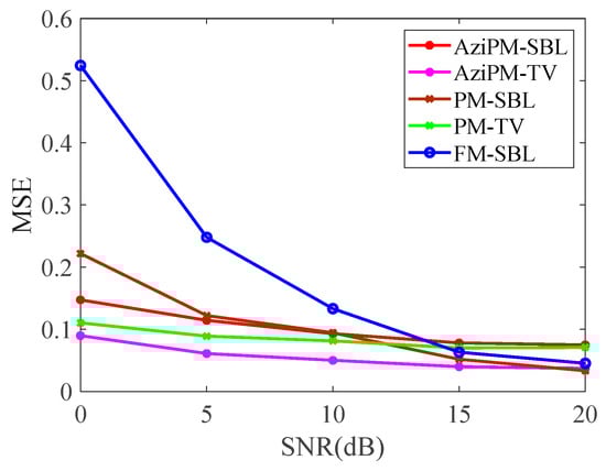 In order to quantitatively analyze the effect of the ADMM-based total variation method on the imaging quality, the MSE curves of this method and the other four methods at different SNRs are plotted in Figure 14. This figure shows that the MSE curves of the five methods all demonstrate a decreasing trend as the SNR increases. The MSEs of the AziPM and PM methods are roughly the same when imaging, whether using the SBL or ADMM-based total variation algorithm. The MSE of FM-SBL is relatively high, while AziPM-TV has the lowest MSE among the different methods, with the curve located at the bottom. This further indicates the effectiveness of the method proposed in this paper.