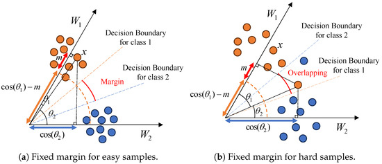 Specifically, for easy samples, a fixed margin can result in a decision boundary, as shown in Figure 3a; the model can classify them correctly but lacks sufficient discrimination. Thus, the margin needs to be increased to further reduce the intra-class distance and expand the inter-class distance, which can yield a more stringent decision boundary (in Figure 3b), expressed as