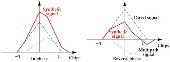 Reflected multipath signals undergo delays, phase shifts, and fading, in contrast to direct signals. To begin with, let us consider the case of a direct signal and one multipath signal. When the direct and multipath signals are in phase (), the sum of their amplitudes is greater than that of any individual component. Conversely, when the direct and multipath signals are out of phase (), the amplitudes of the two components will attenuate. A schematic diagram of the composite correlation peak is shown in Figure 2.