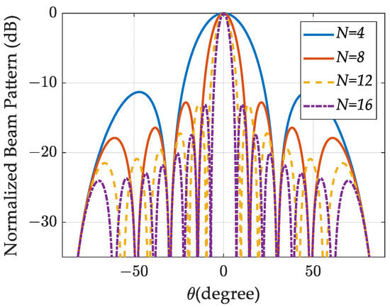 (4) Generate the array beam pattern, , by employing the procedure outlined in Equation (8), through which the angle, , is scanned from −90 degrees to 90 degrees.
