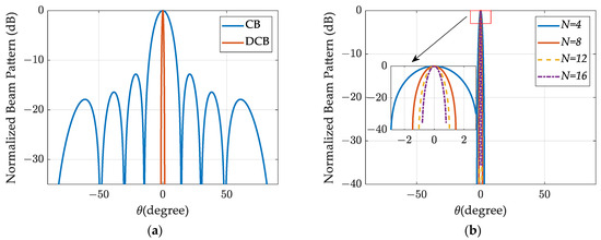 Super-directional beam pattern: (a) the comparison of CB and DCB; (b) the comparison of DCB under different numbers of array elements.