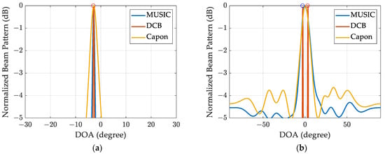 The spatial spectrum plots in Figure 6 showcase the performance of various DOA estimation methods, including Capon, MUSIC, and the proposed method. Figure 6a displays the spatial spectrum results under single-signal-source conditions with an incident angle of −2.96° and a carrier-to-noise ratio () of 45 dBHz. Figure 6b presents the spatial spectrum results under conditions with one direct signal and one multipath signal, where the incident angles for the direct and multipath signals are −2.96° and 3.06°, respectively. It can be observed that even in the presence of two signal sources, the DCB method maintains good resolution capabilities, while the MUSIC and Capon methods fail to resolve the directions towards the signal sources.
