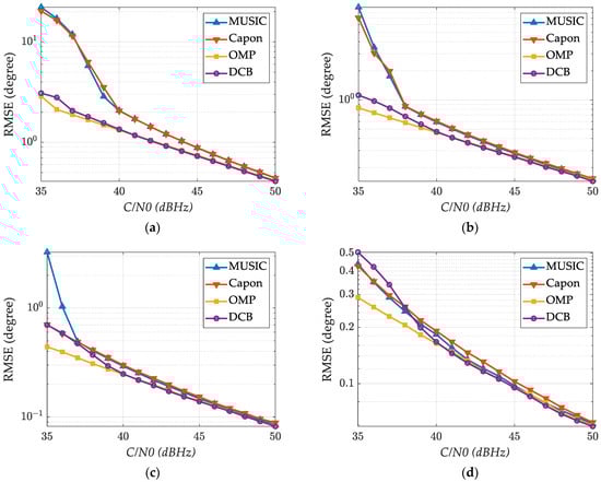 Figure 8 presents the RMSE results for different input signals, , and array sizes, with increasing from 30 dBHz to 50 dBHz. Figure 8a–d illustrate the results for scenarios , respectively. The results show a significant improvement in DOA estimation accuracy with increasing . When is low, the performance of the OMP method is slightly better than that of the proposed method, and both of them are significantly better than MUSIC and Capon. As increases, the DCB method can achieve a similar performance to OMP. Moreover, higher array sizes lead to greater estimation accuracy. The proposed method consistently outperforms the other methods, validating its effectiveness. Even under low-signal-to-noise-ratio conditions, satisfactory estimation results can still be achieved.