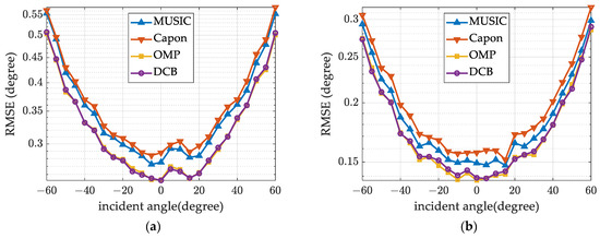 In Figure 9, the DOA estimation results are presented for varying incident angles within the range of [−60, 60]. Figure 9a,b show the estimation errors when the number of array elements is N = 8 and N = 12, respectively. It can be seen from Figure 9 that the estimation error increases with the increase in the incident angle, and the greater the number of array elements, the smaller the estimation error. The performance of the proposed method and the OMP method is better than that of the MUSIC method and the Capon method.