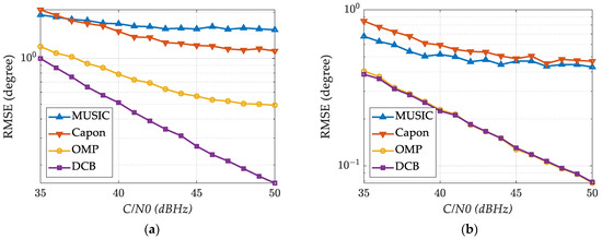 The simulation parameters were as follows: a GPS L1 C/A signal was simulated, the code frequency was 1.023 Mbps, the signal sampling rate was 6 MHz, and the coherent integration time was 1 ms. The performance of the proposed method was verified using Monte Carlo simulation with 1000 iterations. The DOA estimation performance was evaluated using the Root Mean Square Error (RMSE), which is defined as follows: