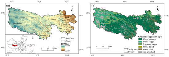 The Three–River–Source Region: (a) digital elevation model and location; (b) grassland vegetation types.