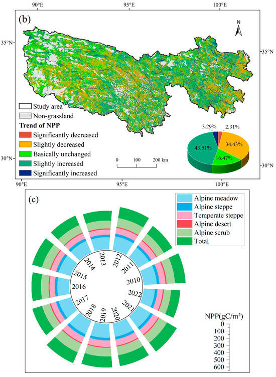The spatiotemporal patterns of grassland NPP in the TRSR from 2010 to 2022: (a) mean annual NPP: the inset chart shows the interannual dynamics of NPP from 2010 to 2022, where the red dashed line shows the overall trend of NPP; (b) change trend of NPP: the inset chart shows the area proportion of each; (c) radial accumulation bar chart of NPP in different grassland vegetation types from 2010 to 2022.