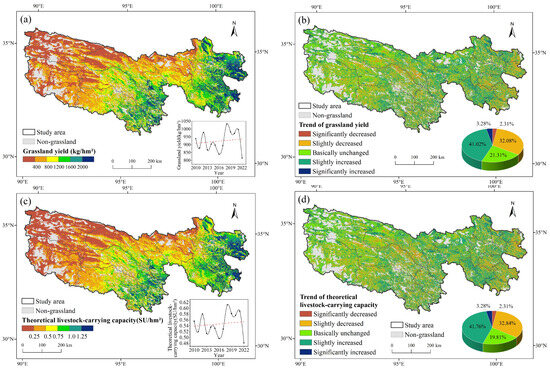 The spatiotemporal patterns of grassland yield and theoretical livestock carrying capacity in the TRSR from 2010 to 2022: (a) mean annual grassland yield: the inset chart shows the interannual dynamics of grassland yield from 2010 to 2022, where the red dashed line shows the overall trend of grassland yield; (b) change trend of grassland yield: the inset chart shows the area proportion of each; (c) mean annual theoretical livestock carrying capacity: the inset chart shows the interannual dynamics of theoretical livestock carrying capacity from 2010 to 2022, where the red dashed line shows the overall trend of theoretical livestock carrying capacity; (d) change trend of theoretical livestock carrying capacity: the inset chart shows the area proportion of each.