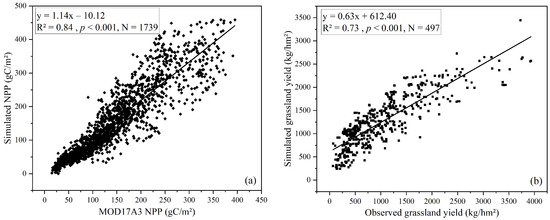 Validations of simulated NPP and grassland yield by improved CASA model: (a) the correlation of simulated NPP by improved CASA model and MOD17A3 NPP, where the solid black line represents the fitting curve of simulated NPP and MOD17A3 NPP; (b) the correlation of simulated grassland yield by improved CASA model and observed grassland yield, where the solid black line represents the fitting curve of simulated grassland yield and observed grassland yield.
