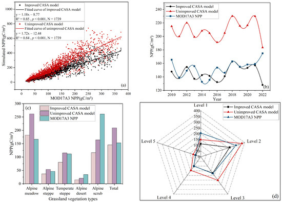 Simulated NPP by improved CASA model and unimproved CASA model compared to MOD17A3 NPP product: (a) scatter plot with MOD17A3 NPP; (b) change curve of NPP from 2010 to 2022; (c) histogram of NPP in different grassland vegetation types; (d) radar map of NPP with different elevation grades.