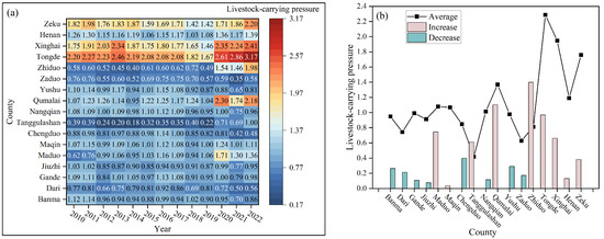 Livestock carrying pressure in the TRSR from 2010 to 2022: (a) heat map of livestock carrying pressure in each county from 2010 to 2022; (b) changes and average values of livestock carrying pressure in each county for 13 years.
