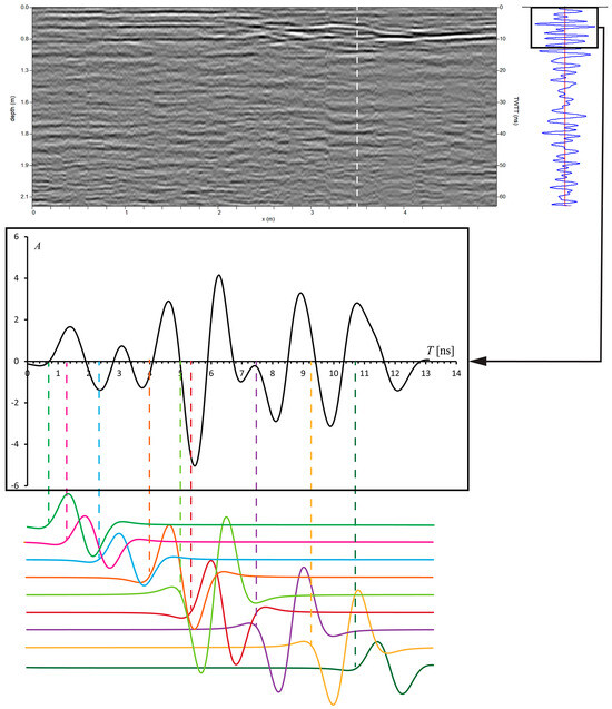 The proposed method of analyzing GPR data requires the selection of key traces from a set of radar profiles. These traces then undergo a procedure of forward modelling, which results in the production of synthetic scans that fit the acquired data. The final step comprises the conversion of the synthetic traces into corresponding reflectivity plots that can be interpreted in terms of buried layers and structures. The method assumes that any observed trace (or A-scan) can be reconstructed by a sequence of Ricker wavelets [18,19]. In the time domain, a zero-phase Ricker wavelet is defined as follows:
