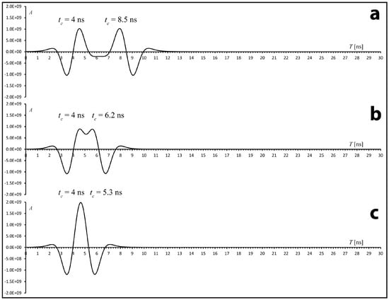 An example of the composition between 90°-phase Ricker wavelets with opposite polarities. The horizontal axis shows two-way travel times. tc is the wavelet central time. (a) When the two wavelets are spaced by more than ~3 ns, their composition shows two distinct reflections. (b) If we increase the amount of overlap, a coalescent reflection forms, but we can still distinguish two positive peaks associated with the two component wavelets. (c) In the case of two strongly overlapped wavelets, a large amplitude peak forms, which could be erroneously interpreted as resulting from a single reflector separating two media characterized by a strong dielectric contrast. Instead, it results from wavelet interference.