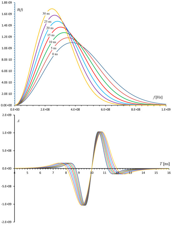 This is the peak frequency that is used to generate a Ricker wavelet at a two-way travel time (TWTT) t. Figure 4 shows the progressive shift in the amplitude spectrum as a function of TWTT, calculated using Equation (8), as well as the attenuation of the corresponding 90°-phase Ricker wavelets.