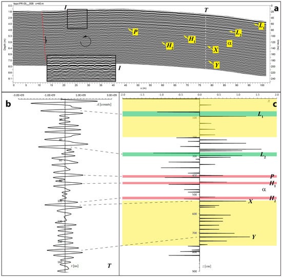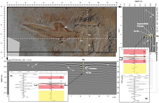 A reddish sediment with a matrix rich in Fe oxides or hydroxides completes the sequence [36]. This assemblage of yellow–black–red (YBR) sediments has a thickness between a few centimeters and a few decimeters. In the case of the specimen at Site P4A, partial excavation has shown the presence of a dolomite nodule around the neurocranium (Figure 10, Figure 11 and Figure 12), while there is no evidence of carbonate concretion surrounding the rest of the skeleton. On the basis of these observations, we would expect the reflection peaks associated with the presence of bones to be closely followed by additional reflections due to the thin Mn-rich and Fe-rich layers. The presence of these layers is also evident in Figure 10, Figure 11 and Figure 12, where they appear to surround the whale carcass. The dielectric constant of manganese oxides is very high, at around 60–70 according to [32], so that the black layer should be observed as a low-velocity interval. However, field observations show that while the inner interface of this bed, close to the bones, is sharp, the bottom part gradually transitions to the sediments rich in Fe oxides [37]. Consequently, the base of the Mn-rich layer and top of the underlying Fe-rich bed were not visible on the radar profiles. The trace analysis performed on representative scans of the radar profiles acquired at site P4A shows that, in most cases, the thin manganese layer is very close to the bones along the bottom side of the skeleton. The correlation between the reflectivity plots in Figure 8, Figure 10, Figure 11 and Figure 12 (see the Supplementary Materials) suggests that the general signature of fossil specimens in this area is a triplet of strong spikes in the sequence: positive–negative–positive (+–+) polarity. In this series, the central negative spike combines the two reflections of equal polarity produced at the lower interface of a bone and at the top of the Mn-rich layer (see Wavelet Packets in the Supplementary Materials). However, in some cases, the black layer has sufficient thickness and separation from the bones to be visible as an independent doublet (e.g., see Figure 11).