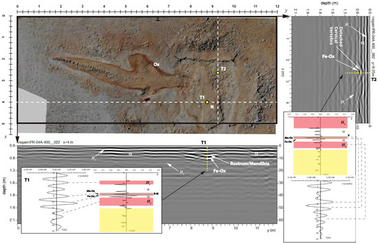 In fact, while the reflectivity peak at the upper interface can be either very strong or just noticeable, the lower reflection is always strong. When both reflection peaks have a large amplitude (see Figure 11), this is most likely a consequence of air being entrapped in the pores and cavities of the buried bones [34]. Several studies have shown that many exceptionally preserved vertebrate fossils of the Pisco Basin are embedded in hard dolomite nodules [36]. These concretions may be more than 10 cm thick and are in contact with the fossil bones. The transition zone of the surrounding undisturbed sediments is formed by a non-laminated yellow layer with abundant authigenic apatite, followed by a very thin (<1 cm) black layer permeated by Mn oxide, which formed below the sediment–water interface at a redox boundary during the decomposition of the carcass [15,37].