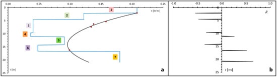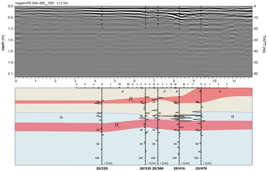 The pairs were used, with the Dix formula [55], to calculate the true velocity of each layer in the model and to convert the TWTTs to depths. Figure 15 shows the results of this analysis for area P4A. This procedure not only allows one to perform a better TWTT–depth conversion, in so far as it allows one to create a model of the ground velocity layering, but also ensures that the reflectivity plots that are built independently by trace analysis are compatible with the velocity profiles observed during migration.