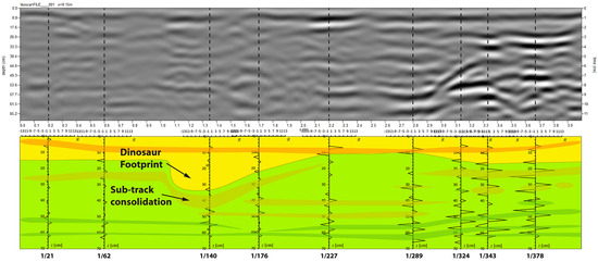 Another example of the results that can be obtained by the method described above is illustrated in Figure 14. These data were acquired at Dinosaur Ridge, Colorado, in 2018 by L. Conyers and his team using a 900 MHz antenna. This site is known for the presence of numerous dinosaur footprints. The reconstruction in Figure 14 illustrates the advantage of using trace analysis for radar profile interpretation. The presence of a dinosaur footprint is not very evident in the profile in Figure 14, because several strong reflections in the right part, not related to the presence of dinosaur remains or their passage, tend to overwhelm the important signals associated with the plantar pressure pattern and the underlying sub-track consolidation [38]. Conversely, the reconstruction obtained by the correlation of several trace analysis reflectivity plots shows a clear pattern that can be interpreted as being due to a dinosaur footprint.